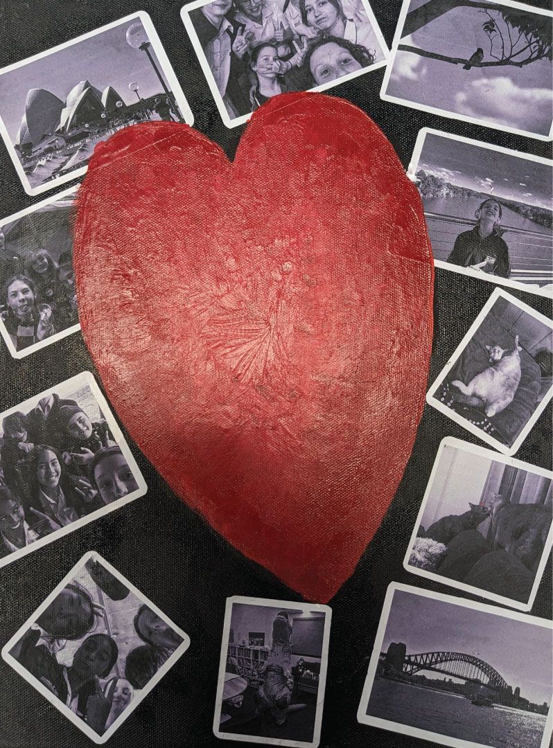 “Connection is a visual representation of how I keep my heart happy when I am not OK. The photographs are of the people and the places I feel deeply connected to. I have placed the black and white photographs on a black background for contrast and used the red heart as a symbol of the love I have for these people and places.”