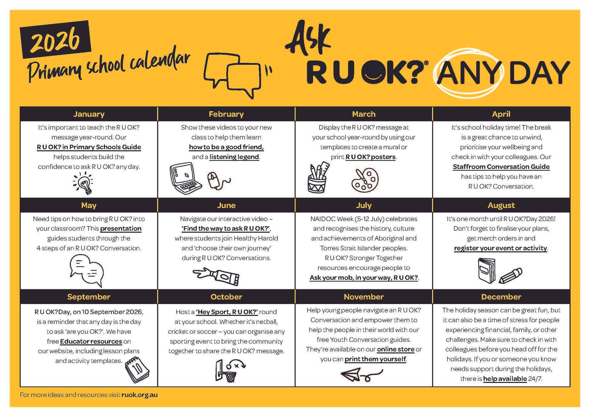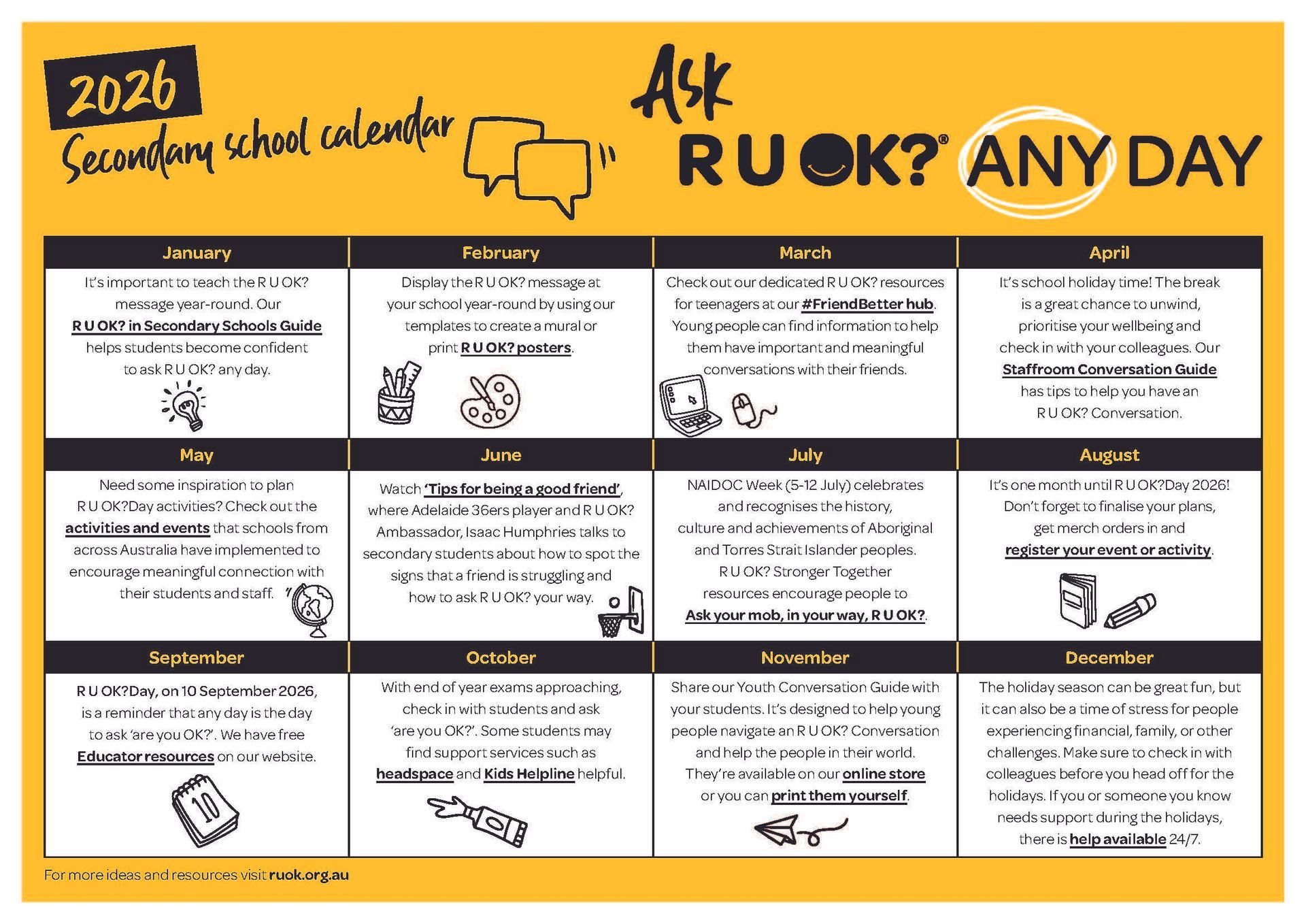 Check out these additional resources to accompany the activity or display as a year-round reminder of the importance of asking R U OK?